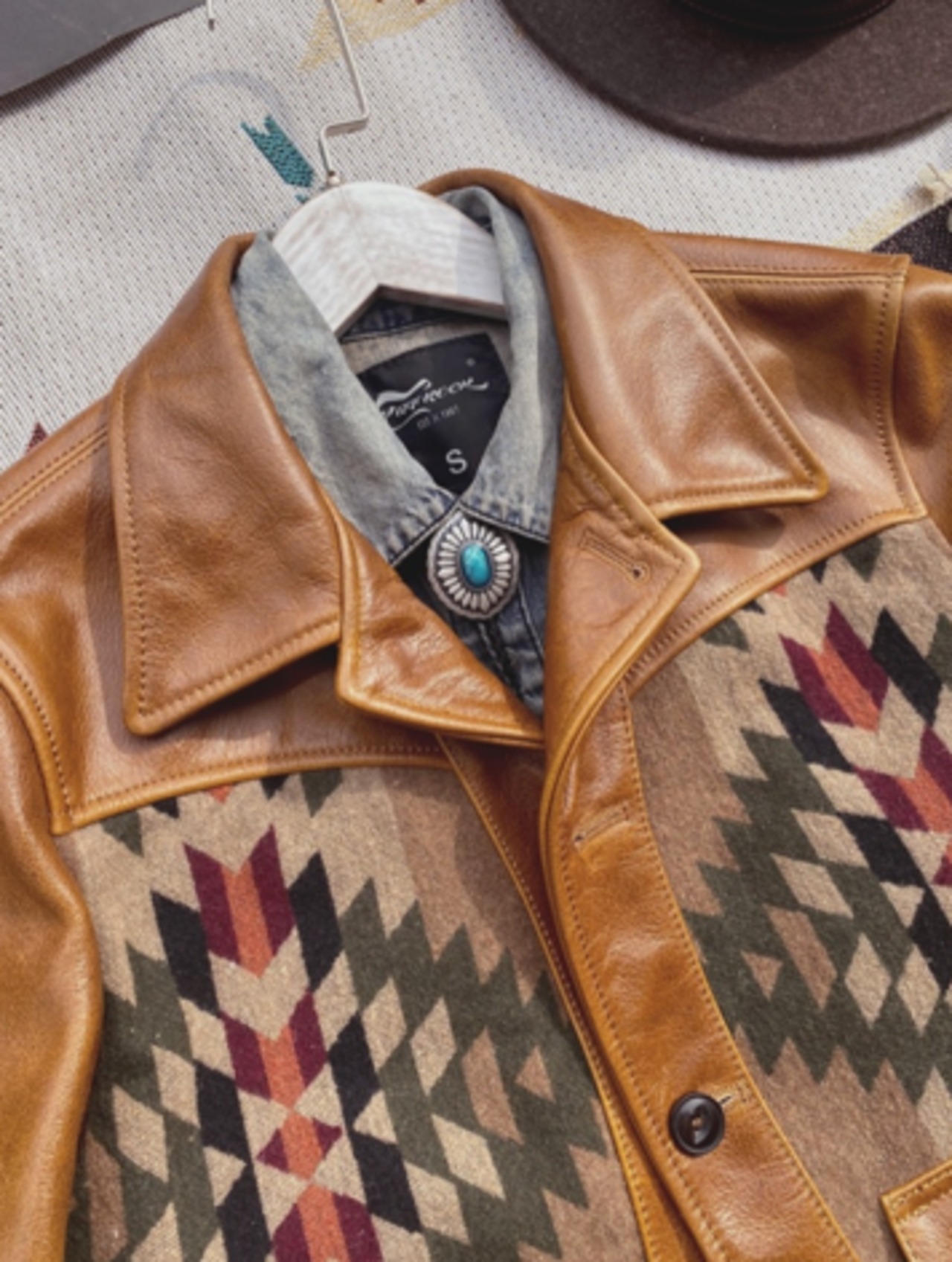 多彩な魅力を持つ、アメリカンレトロなパッチワークレザージャケット。上質なナバホオイルワックス牛革を使用し、独特の風合いを引き立てるデザインが特徴です。カラーとテクスチャーのバリエーションを活かしたパッチワーク仕立ては、一つ一つ異なる表情を楽しむことができます。